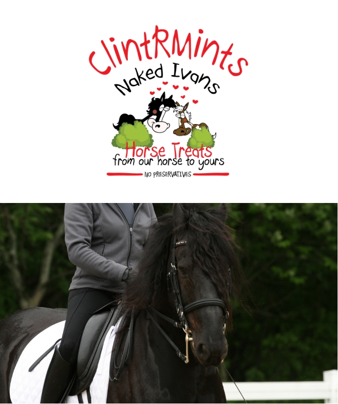Soon, having just one flavor of ClintRMints was not enough. A customer bought some at a horse show and then contacted me asking if they could be made without peppermints for her Fresian Ivan. So we did, just for her at the beginning, but then at the Michigan Horse Expo, we received more requests for no peppermints. So another friend suggested ‘Naked Ivans’ as a name, since they were without peppermints. Ivan is featured on the label, shyly hiding behind a bush, with his pasture friend Paintbrush.